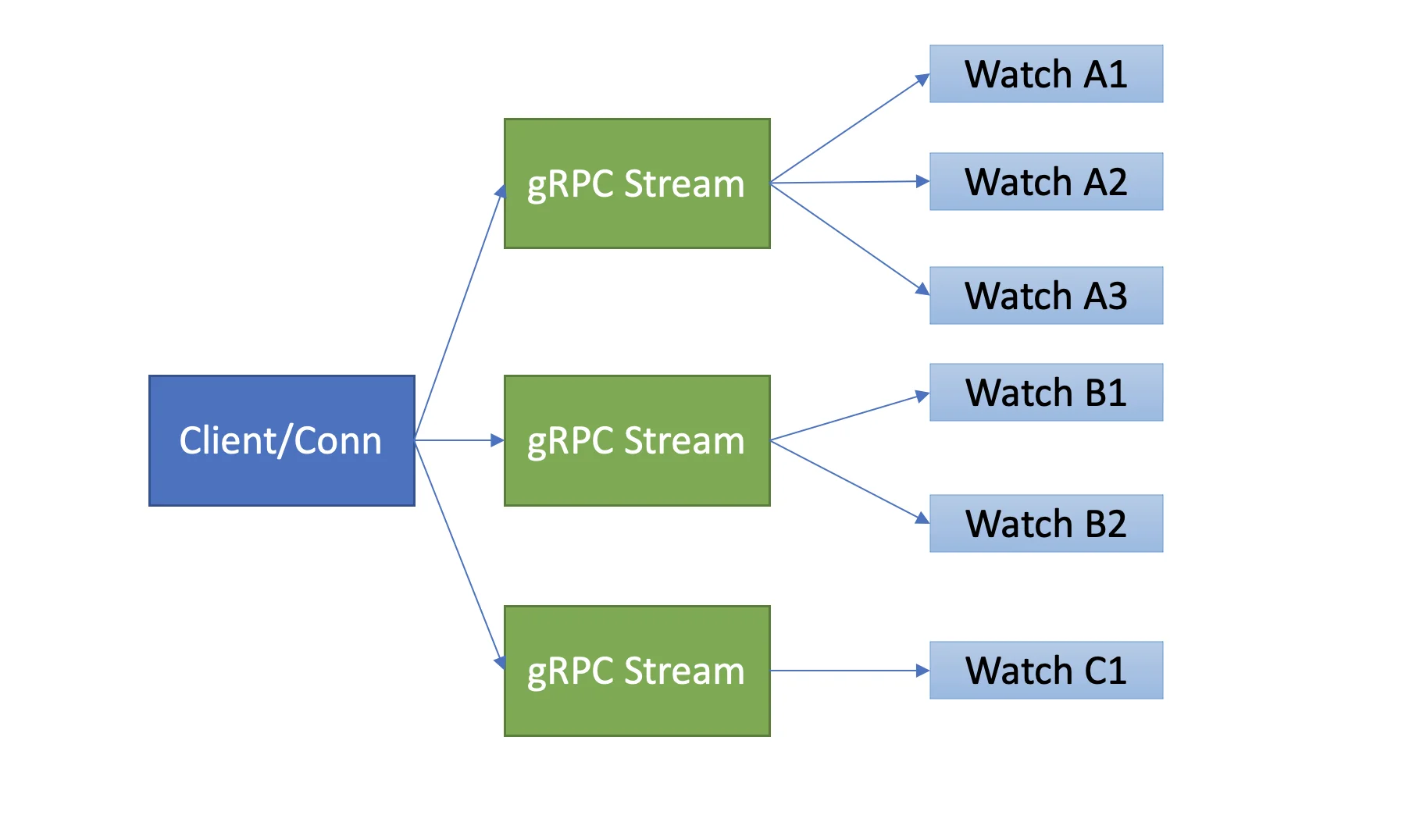 实现了一个客户端/TCP 连接支持多个 gRPC Stream,每个 gRPC Stream 又可以支持多个 watcher,大大减少了服务器资源的占用,并提高了效率。