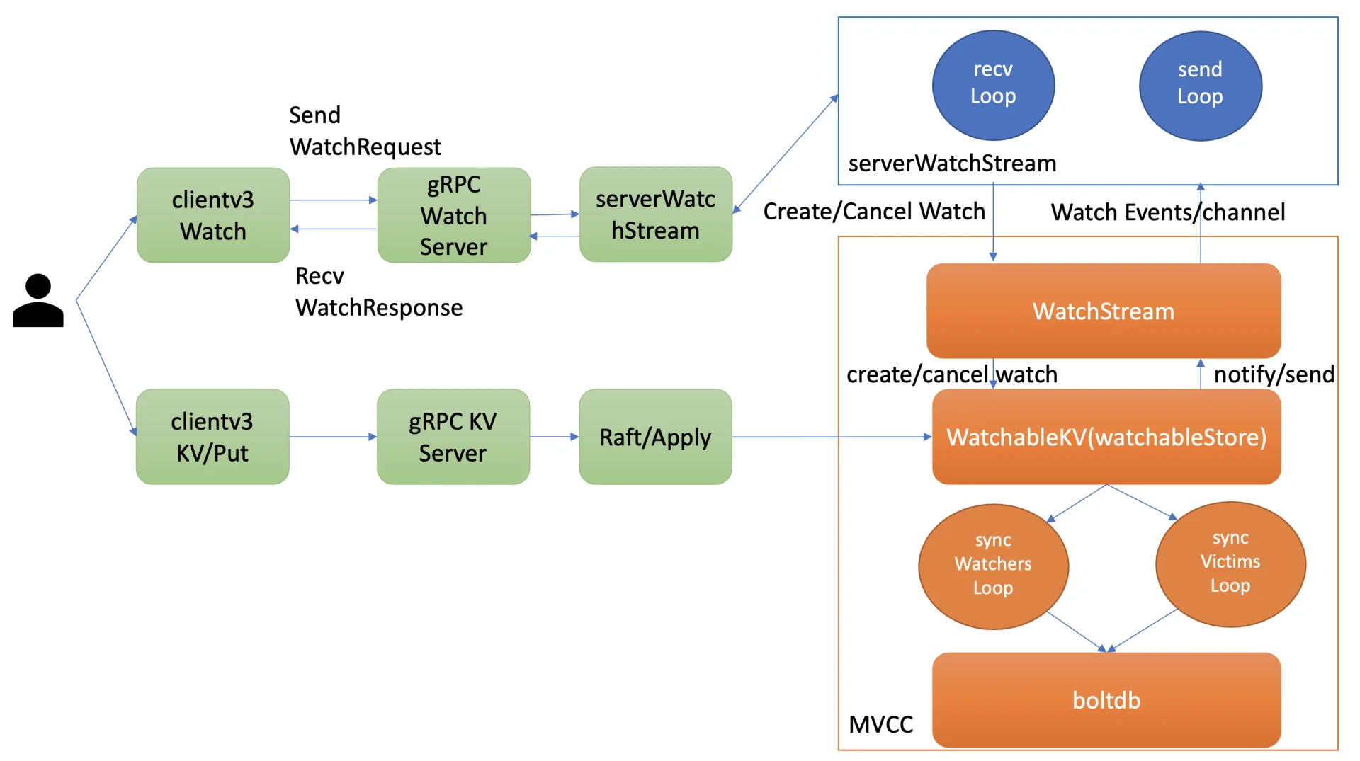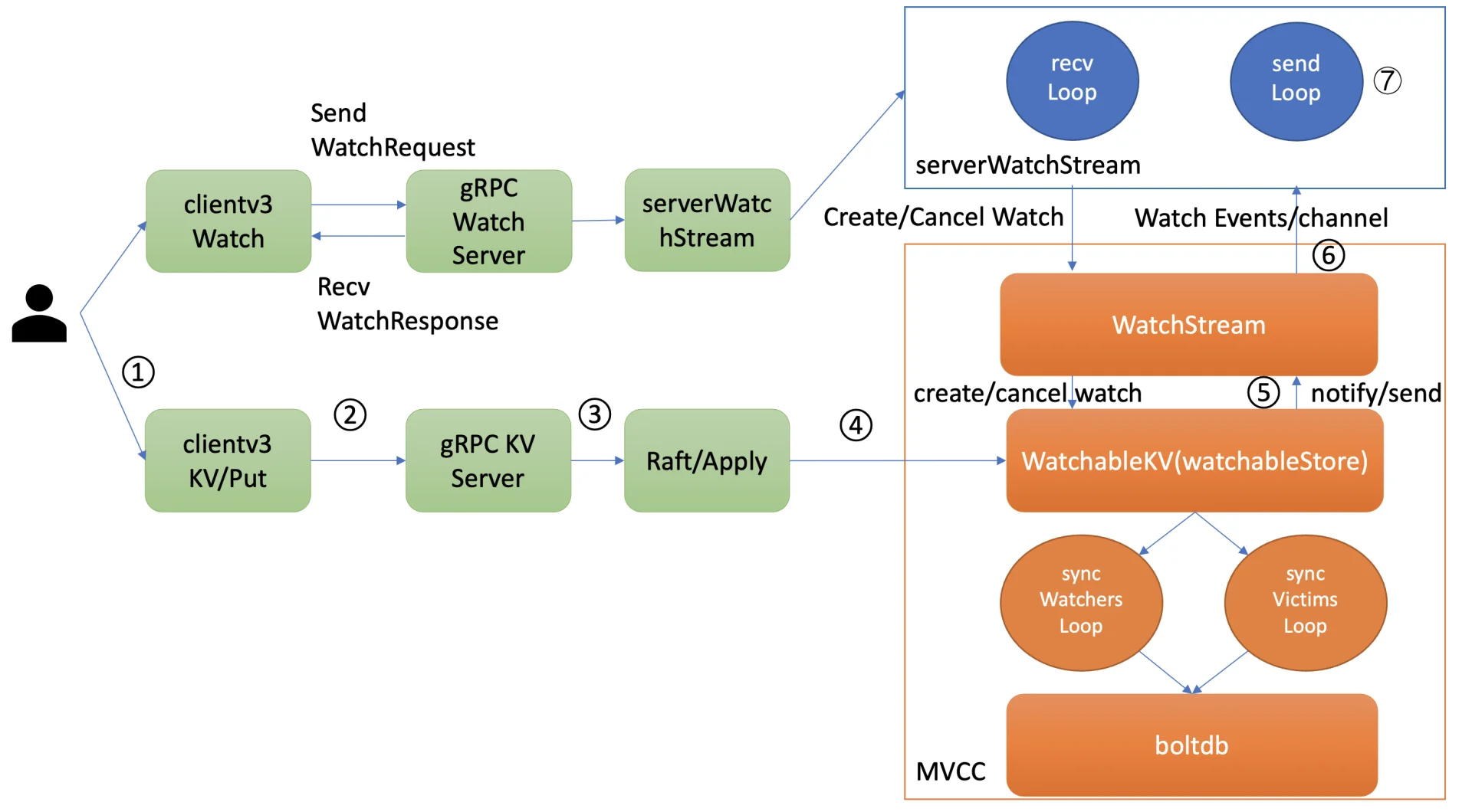 创建 watcher 后,它会被注册到 MVCC 的 WatchableKV 模块中,该模块负责运行 syncWatchersLoop 和 syncVictimsLoop goroutine 来确保事件的可靠推送。