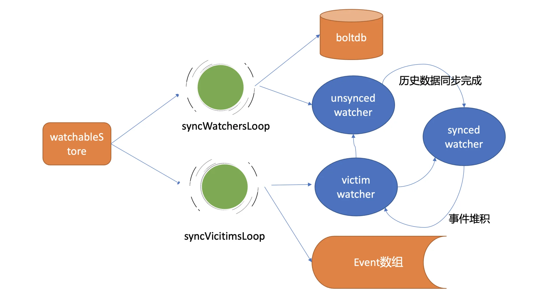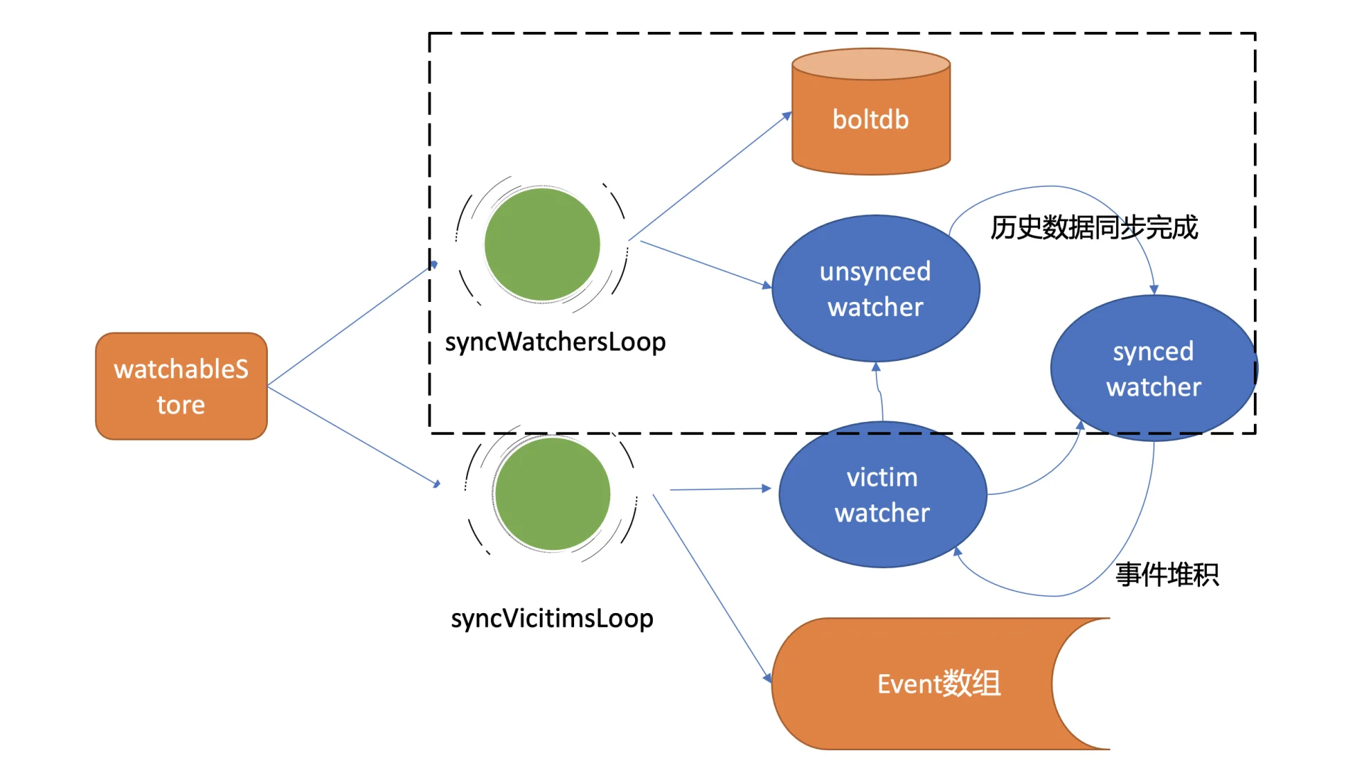 核心模块是 watchableStore,它将 watcher 分为 synced、unsynced 和 victim 三类,针对不同场景下的事件推送需求进行了分类管理。