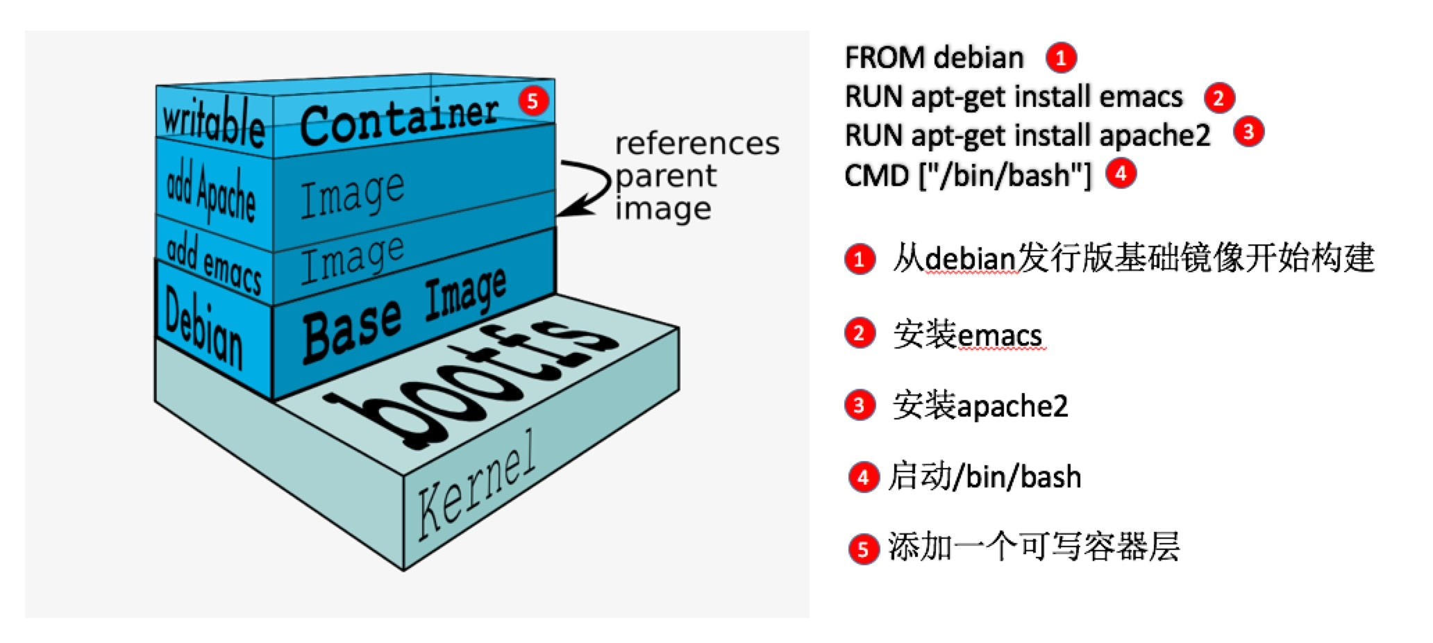 这是一种手工创建镜像的方式,容易出错,效率低且可重复性弱。比如要在 debian base 镜像中也加入 vi,还得重复前面的所有步骤。