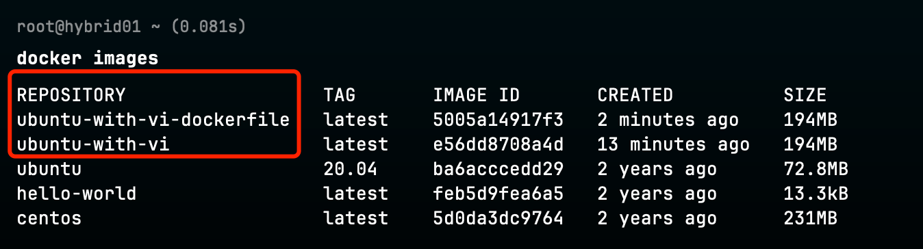 通过两种方式构建好的镜像如下: