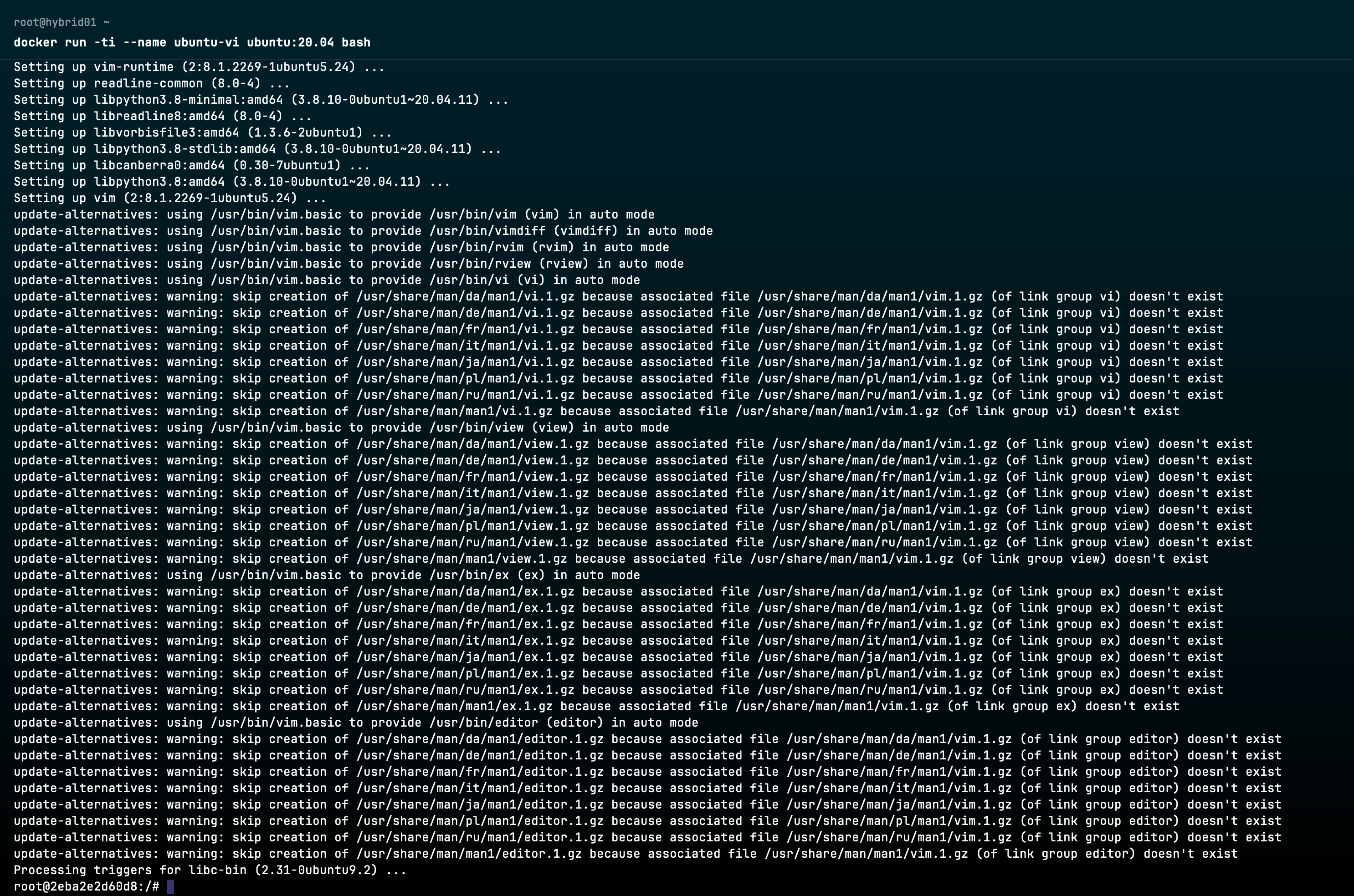 docker run -ti --name ubuntu-vi ubuntu:20.04 bash