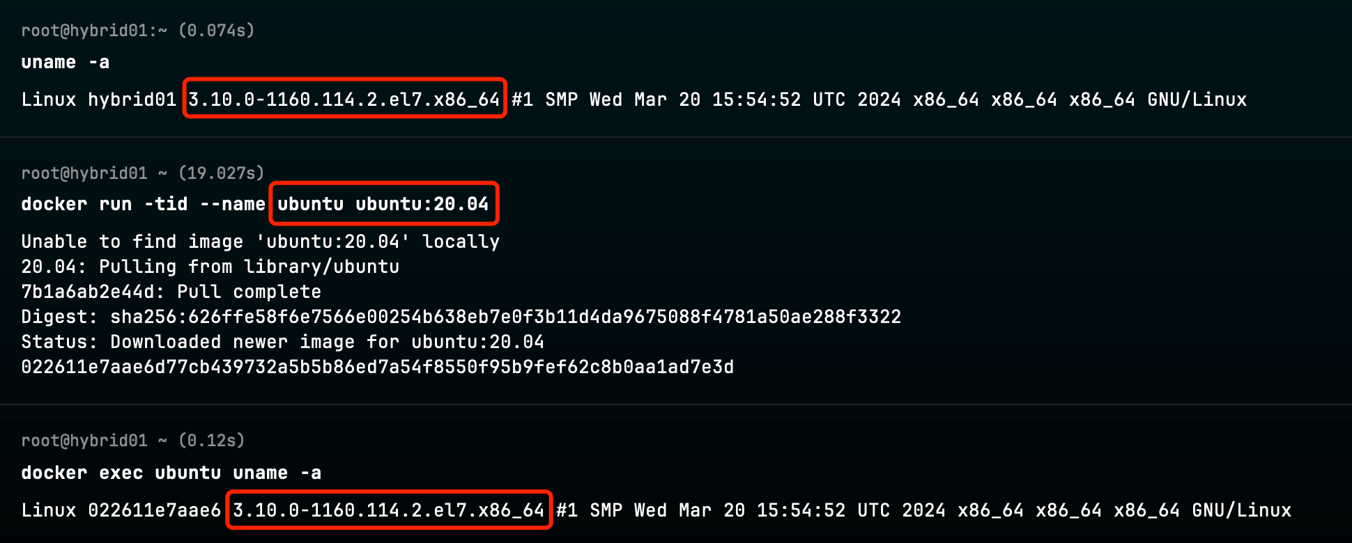 如下,在 CentOS 7 宿主机上运行 Ubuntu 20.04 容器,看到容器的内核和宿主机的内核相同,容器复用了宿主机的内核: