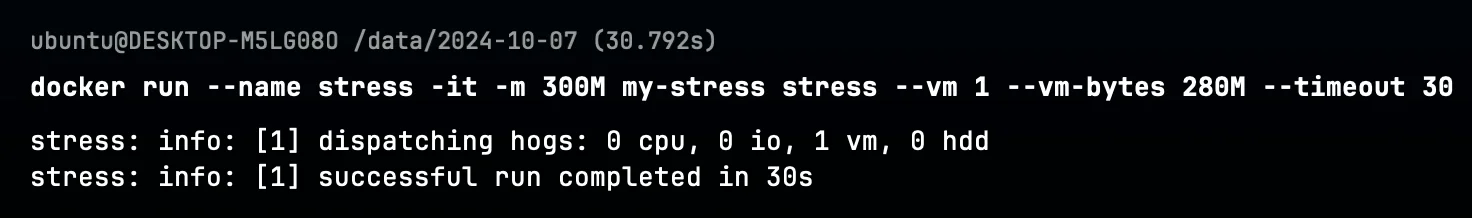 docker run --name stress -it -m 300M my-stress stress --vm 1 --vm-bytes 280M --timeout 30未超过限额,容器启动成功