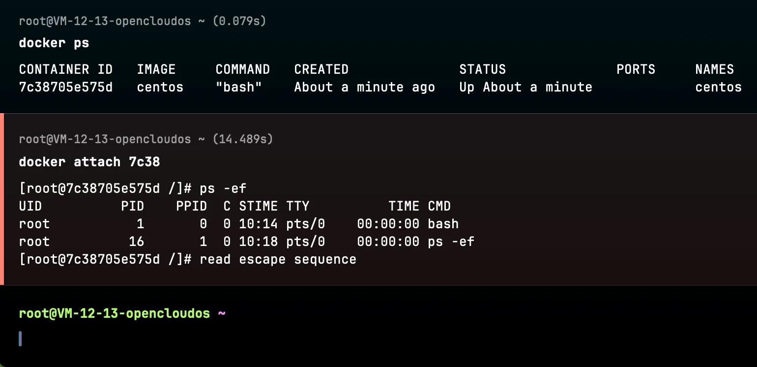 通过 docker attach 可以 attach 到容器启动命令的终端,可通过 Ctrl+p 然后 Ctrl+q 组合键退出 attach 终端。