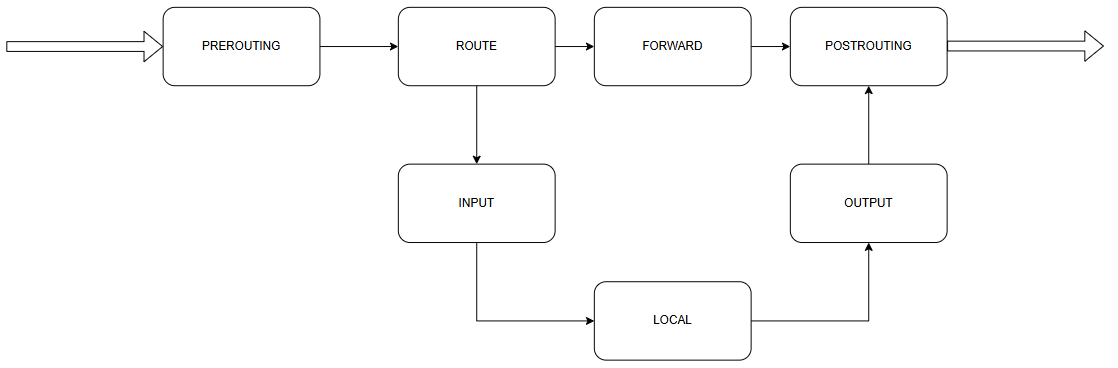 postrouting:在数据包被路由之后处理数据包,常用于 SNAT。如:局域网共享一个公网 IP 接入 Internet。