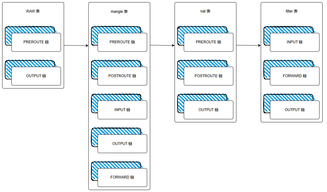 表(Tables):作为规则的分类器,不同的表承载着特定功能的规则集,如 filter 表用于数据包过滤,nat 表用于地址转换,mangle 表则用于数据包的修改。