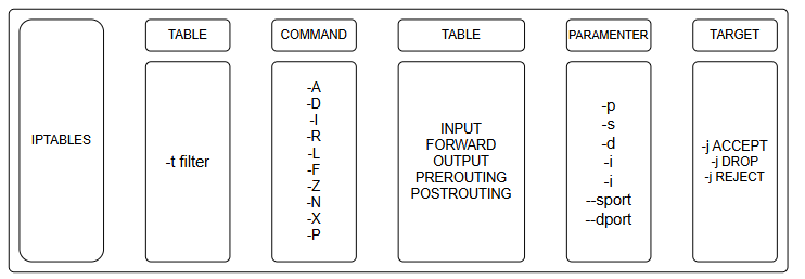 -t table:用来指明使用的表,有三种选项: filter,nat,mangle。若未指定,则默认使用 filter 表。