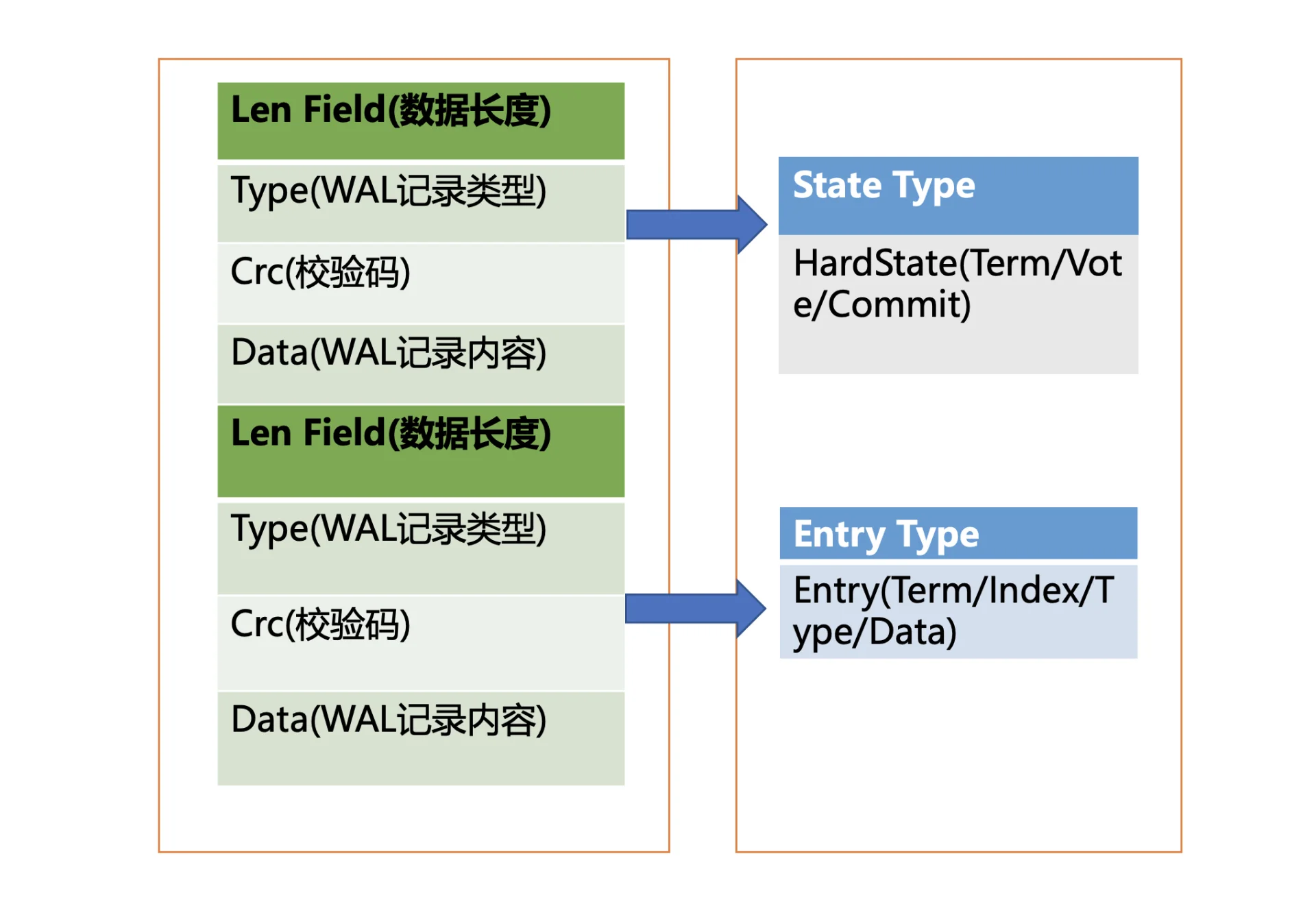 然后计算 Data 的 CRC 值,设置 Type 为 Entry Type,以上信息就组成了一个完整的 WAL 记录;