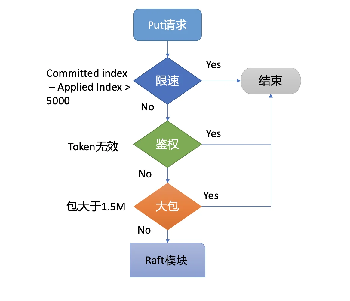 为了保证集群稳定性,避免雪崩,任何提交到 Raft 模块的请求,都会做一些简单的限速判断。如下面的流程图所示。