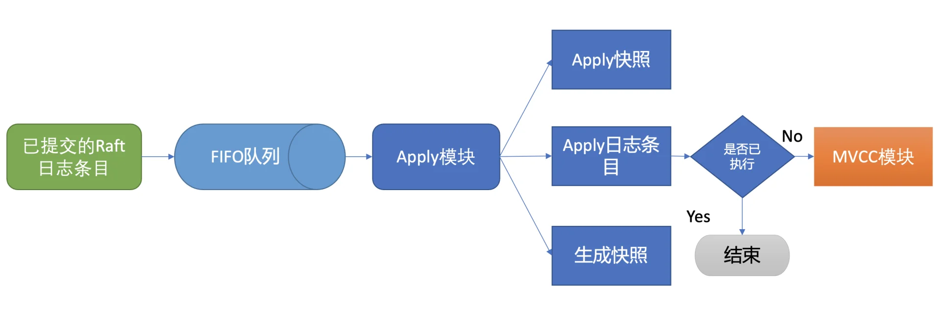 于是进入流程六,etcdserver 模块从 Channel 取出提案内容,添加到先进先出(FIFO)调度队列,随后通过 Apply 模块按入队顺序,异步、依次执行提案内容。